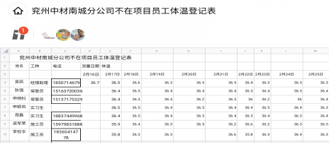 三、加強(qiáng)員工管理,落實(shí)檢查制度 分公司建立多種檢查制度,通過(guò)現(xiàn)場(chǎng)人員現(xiàn)場(chǎng)檢查、在項(xiàng)目隔離人員與未返工員工自查等多種形式進(jìn)行人員健康狀況監(jiān)測(cè),并如實(shí)記錄,如有異常者及時(shí)送醫(yī)就診,做到“早發(fā)現(xiàn),早隔離,早上報(bào),早治療”,切斷傳播途徑,杜絕疫情蔓延。 1、現(xiàn)場(chǎng)人員檢查