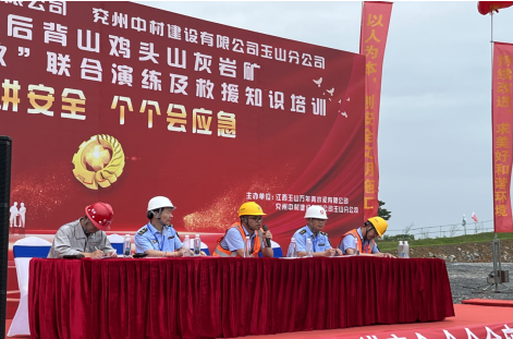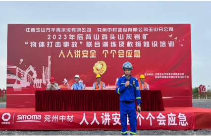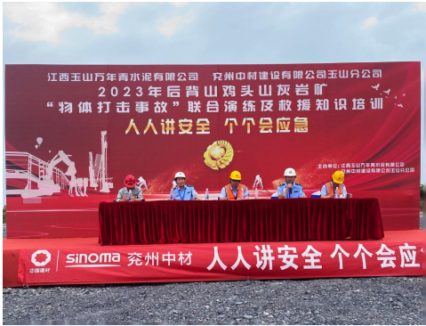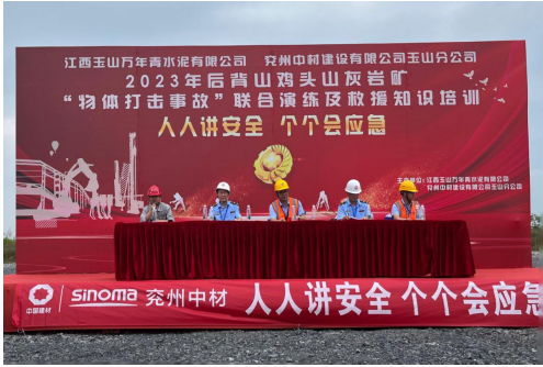 為深入宣貫黨的二十大精神和習(xí)近平總書(shū)記關(guān)于安全生產(chǎn)重要論述,進(jìn)一步樹(shù)牢“以人為本、安全發(fā)展”的安全生產(chǎn)管理理念,貫徹“安全第一、預(yù)防為主、綜合治理”的安全生產(chǎn)方針,強(qiáng)化非煤礦山事故應(yīng)急救援管理工作和應(yīng)急救援隊(duì)伍建設(shè),切實(shí)提高分公司應(yīng)對(duì)礦山突發(fā)事故的聯(lián)合應(yīng)急救援綜合能力,6月17日,兗州中材玉山分公司聯(lián)合江西玉山萬(wàn)年青水泥有限公司、玉山縣藍(lán)天救援隊(duì)、玉山縣人民醫(yī)院等舉辦2023年“物體打擊事故”聯(lián)合演練及救援知識(shí)培訓(xùn)活動(dòng)。玉山縣應(yīng)急管理局局長(zhǎng)吳高峰、玉山萬(wàn)年青水泥有限公司總經(jīng)理李躍華等出席本次活動(dòng)并致辭。